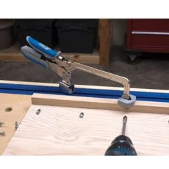 These versatile clamps are perfect for creating flush-fitting assemblies with Kreg Joinery, and they’re great for project assembly, routing, cutting, sanding, drilling, and more. Bench Clamps work with Clamp Trak, Clamp Plates, Clamp Table and Mobile Project Center to secure workpieces using an extra-large padded clamp face that evenly distributes clamping force. Thanks to Automaxx auto-adjust technology, Bench Clamps adjust to match material thickness automatically with a simple squeeze of the handles. Whether the material is thick, thin, or in between, you can clamp a 2×4 and then a piece of 1/2″ plywood without ever readjusting the clamp. It’s easy to regulate clamping pressure with a simple thumbscrew. Just set your desired pressure by turning the thumbscrew for more or less pressure. Once the pressure is set, the clamp maintains consistent clamping pressure with every thickness. Bench Clamps are designed to withstand years of heavy use, thanks to heavy-duty, all-metal construction. They also have ergonomic padded grips for comfort and ease of use.
