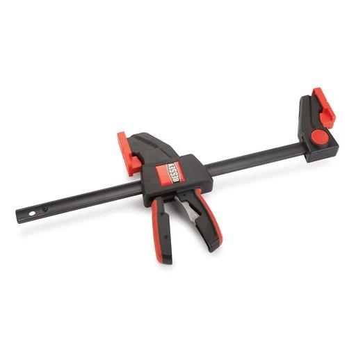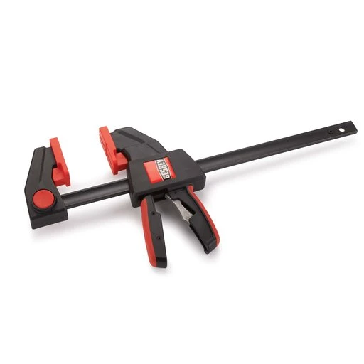 What separates the BESSEY EHK series trigger clamps from the competition is engineering that offers a clean design, comfortable handles, a potential clamping force of 300 lbs. for the EHKL and 600 lbs. for the EHKXL, and the ability to quickly switch from clamping to spreading mode without tools. To change modes, simply push the locking mechanism to disengage the fixed jaw, move it to the opposite end of the rail, and re-engage it.