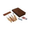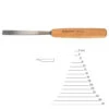 This 1/16″ veiner features a hardwood handle with a metal ferrule. The design of the tool keeps your fingers close to the cutting edge and the half-round palm-grip handle features a flat spot that keeps it from rolling off your bench. Overall length of the tools is 4-3/4″. Factory sharpened and ready for use